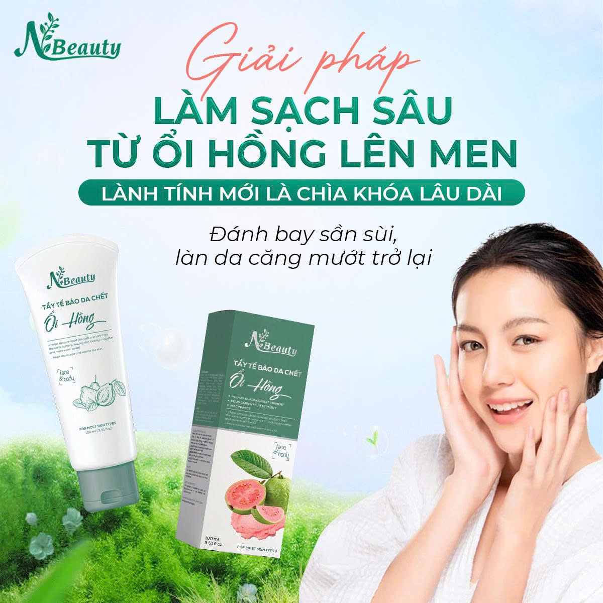 - Dịu nhẹ nhờ chiết xuất ổi hồng lên men, Tẩy tế bào chết Ổi Hồng sẽ bí quyết duy trì làn da mịn màng, thông thoáng và khỏe mạnh.