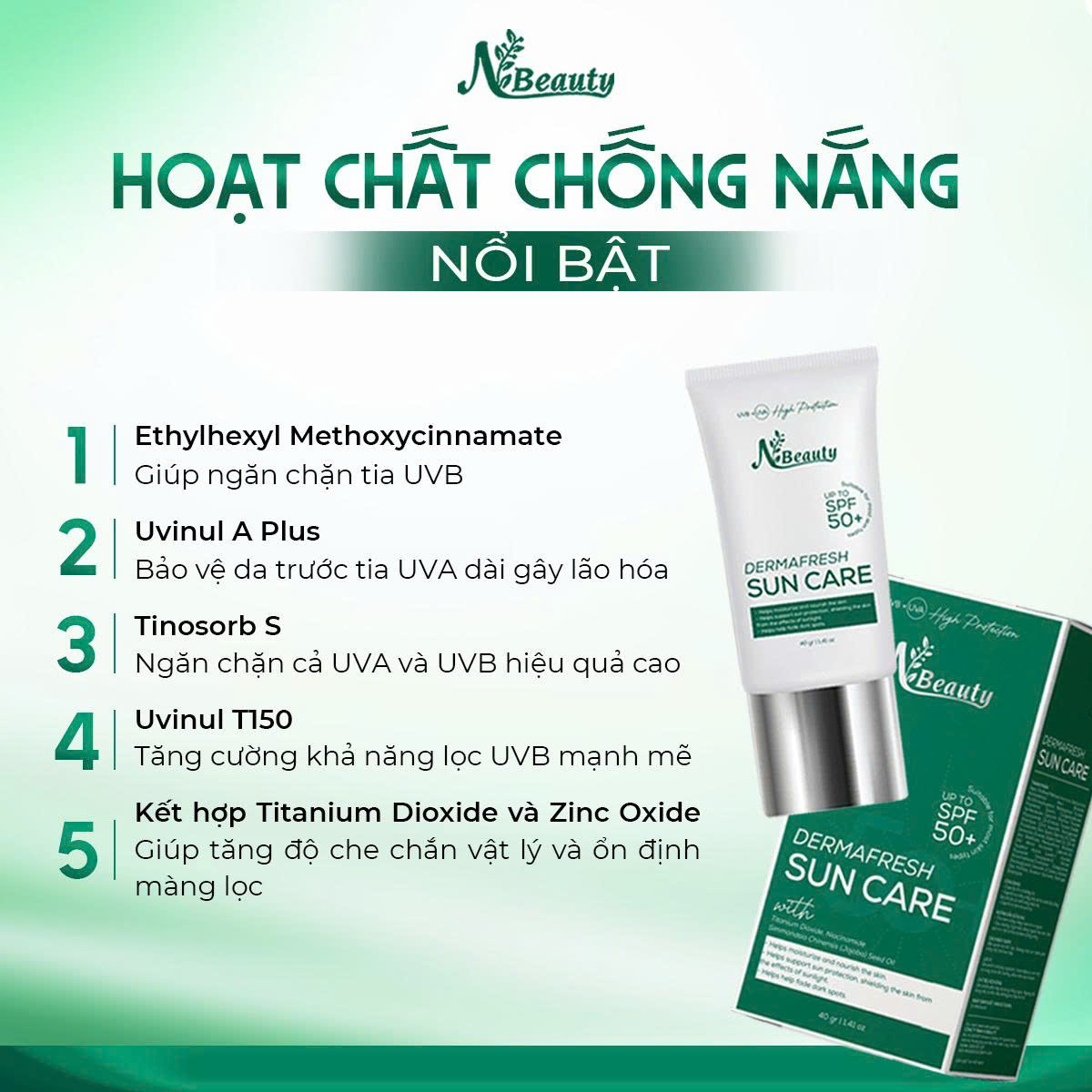 Màng lọc hóa học tiên tiến hấp thụ tia UV hiệu quả, bảo vệ da tối ưu, chống nắng vật lý tạo lớp màng chắn phản xạ tia UVA & UVB.